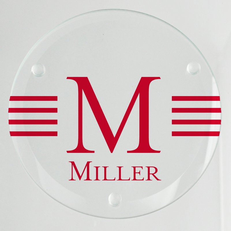 Our Millport Glass Coaster - Printed Raised Ink includes a set of four, jade glass coasters (4" round x 3/16" thick). Enter your single initial (required) and an optional bottom line of text. We will engrave your personalization and the parallel lines artwork with expert precision.